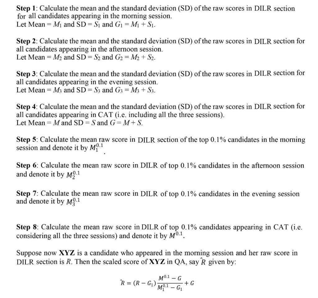 As explained in step 3 above, since CAT is conducted in three shifts with totally different question papers, the level of difficulty can vary slightly across slots. To ensure fairness to all candidates, the raw scores obtained by the candidate in each section (VARC, DILR, and QA) are adjusted using a statistical CAT normalization process. This process adjusts the CAT scores for all candidates for all slots by considering factors such as the mean and distribution of scores in each slot. The result of this step is the scaled score for each section, which allows scores from different slots to be compared on a common scale. Check complete details in the image below that is the explanation of official CAT Normalization Process.